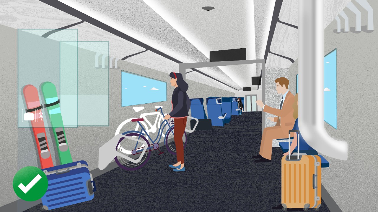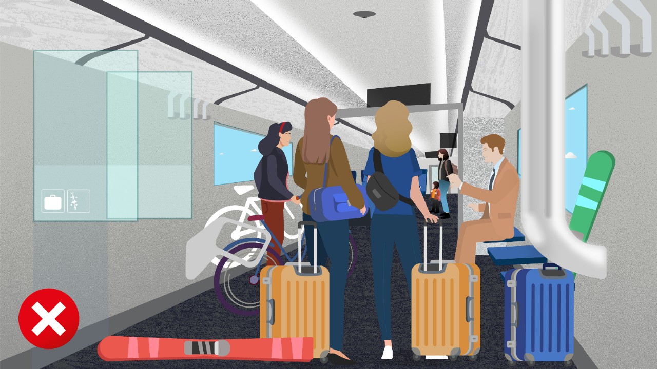 Freie Durchgänge und Fluchtwege im Zug sind wichtig, damit alle Reisenden sich im Notfall schnell und sicher bewegen können. Stellen Sie Gepäckstücke, Kinderwagen, Rollkoffer, Fahrräder und Einkaufstaschen nicht in Türbereichen oder in den Gängen ab.