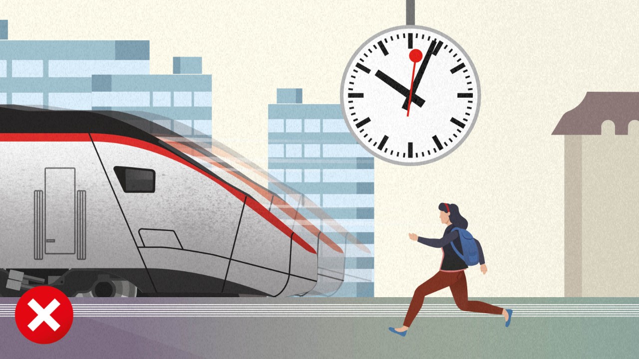 Kommen Sie einige Minuten vor Abfahrt zum Bahnhof, um sicher und bequem einzusteigen. Bitte verteilen Sie sich auf dem Perron, damit der Personenfluss nicht gestört wird. Das Aufspringen oder Berühren eines losfahrenden Zugs ist grob fahrlässig und gefährlich. Die Trittbretter sind eingeklappt und die Türen verriegelt. Es besteht das Risiko, hängen zu bleiben und mitgeschleift zu werden, zu stürzen oder unter die Räder zu geraten.