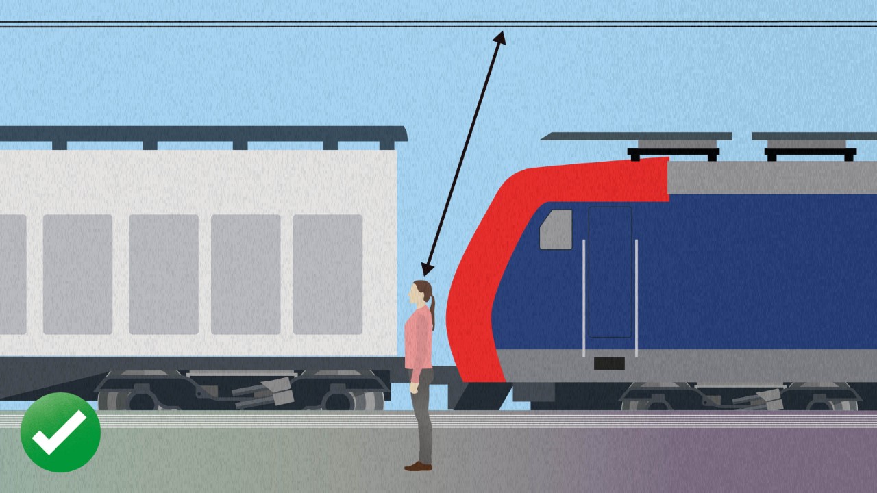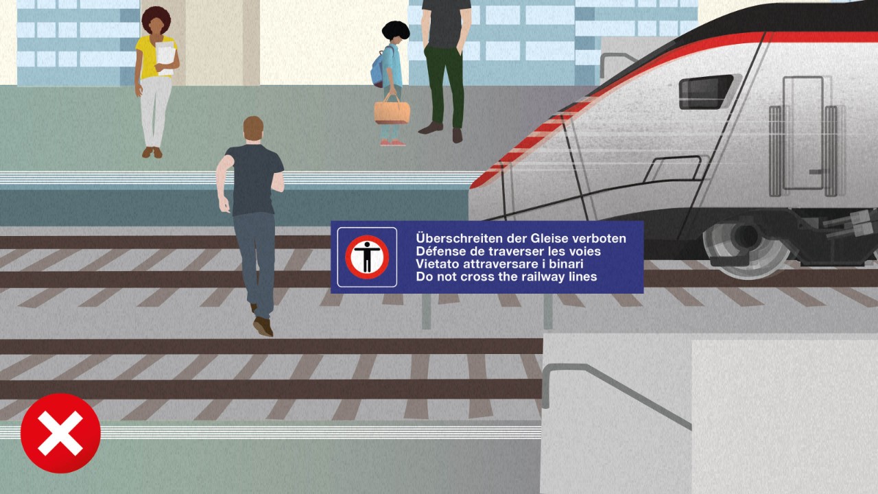 Nutzen Sie Unterführungen oder Passerellen, um die Gleise zu überqueren, und respektieren Sie geschlossene Barrieren an Bahnübergängen. Das Überqueren der Gleise ausserhalb eines Übergangs ist verboten. Züge sind nicht immer im Fahrplan und können jederzeit fahren. Ein Zug kann fast 40 m/s zurücklegen. Bei einer Notbremsung mit 140 km/h braucht ein Zug bis zu einem Kilometer, um zu stoppen. Der:die Lokführer:in hat keine Chance, wer über die Gleise rennt auch nicht.