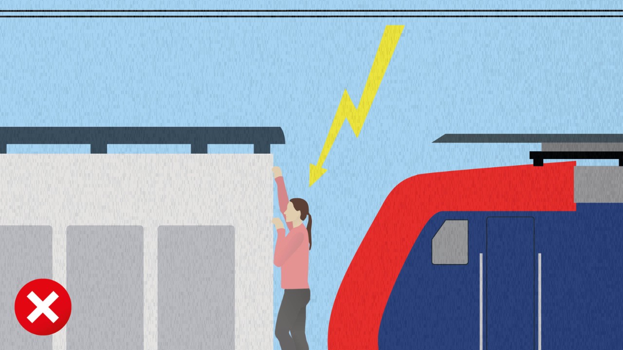 Das Klettern auf Bahnwagen ist lebensgefährlich und streng verboten. Halten Sie Abstand von Fahrleitungen, abgestellten Zügen und Güterwagen, sowohl im als auch ausserhalb des Bahnhofs. Warnen Sie andere vor den Gefahren und stoppen Sie sinnlose Mutproben. Die Spannung der Fahrleitungen beträgt 15000 Volt. Kommt man in die Nähe der Fahrleitung oder berührt die Fahrleitung direkt, kann dies zu lebensgefährlichen Verbrennungen, schweren inneren und äusseren Verletzungen oder zum Tod führen.
