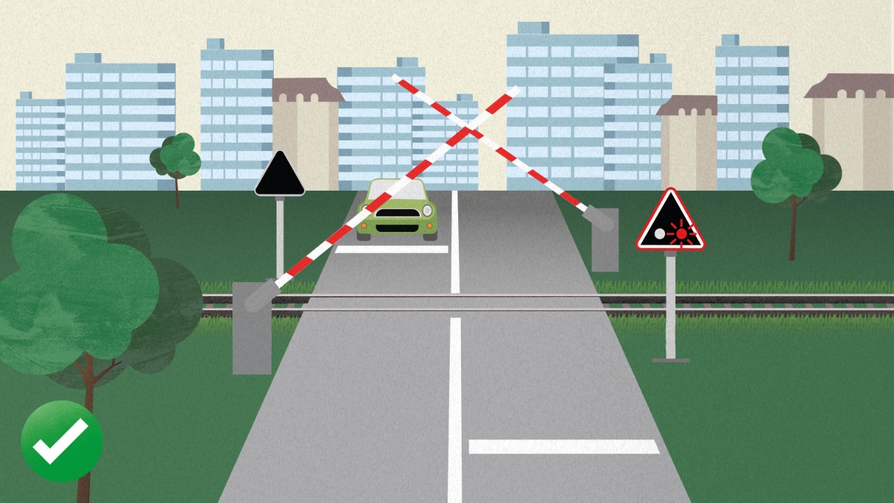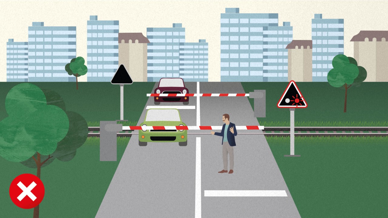 Versuchen Sie auf keinen Fall, einen Bahnübergang zu überqueren, wenn die Schranken sich schon schliessen, die roten Warnlichter blinken oder das akustische Warnsignal ertönt. Wenn Sie mit dem Auto zwischen den Schranken eingeschlossen sind: Fahren Sie weiter und durchbrechen Sie die Schranke. Die Schranke hat eine Sollbruchstelle dafür. Verlassen Sie den Bahnübergang sofort und bringen Sie sich in Sicherheit, bevor der Zug kommt.