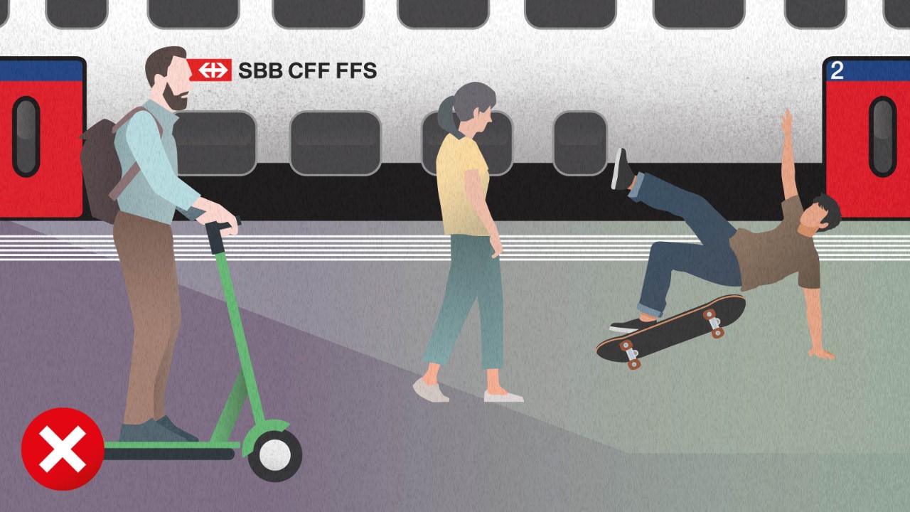 Nutzen Sie weder Fahrzeuge noch Spielsachen auf dem Bahnhofsareal. Respektieren Sie das Fahrverbot und sorgen Sie dafür, dass Kinder nicht in Gleisnähe spielen. Spielen und Fahren mit Fahrrad, Trottinett oder Skateboard im Bahnhof ist gefährlich. Im gesamten Bahnhof (inklusive Perrons, Rampen, Treppen, Hallen, Über- und Unterführungen) besteht deshalb ein Fahrverbot für alle Fahrzeuge ausser Rollstühlen und bewilligten Fahrten.