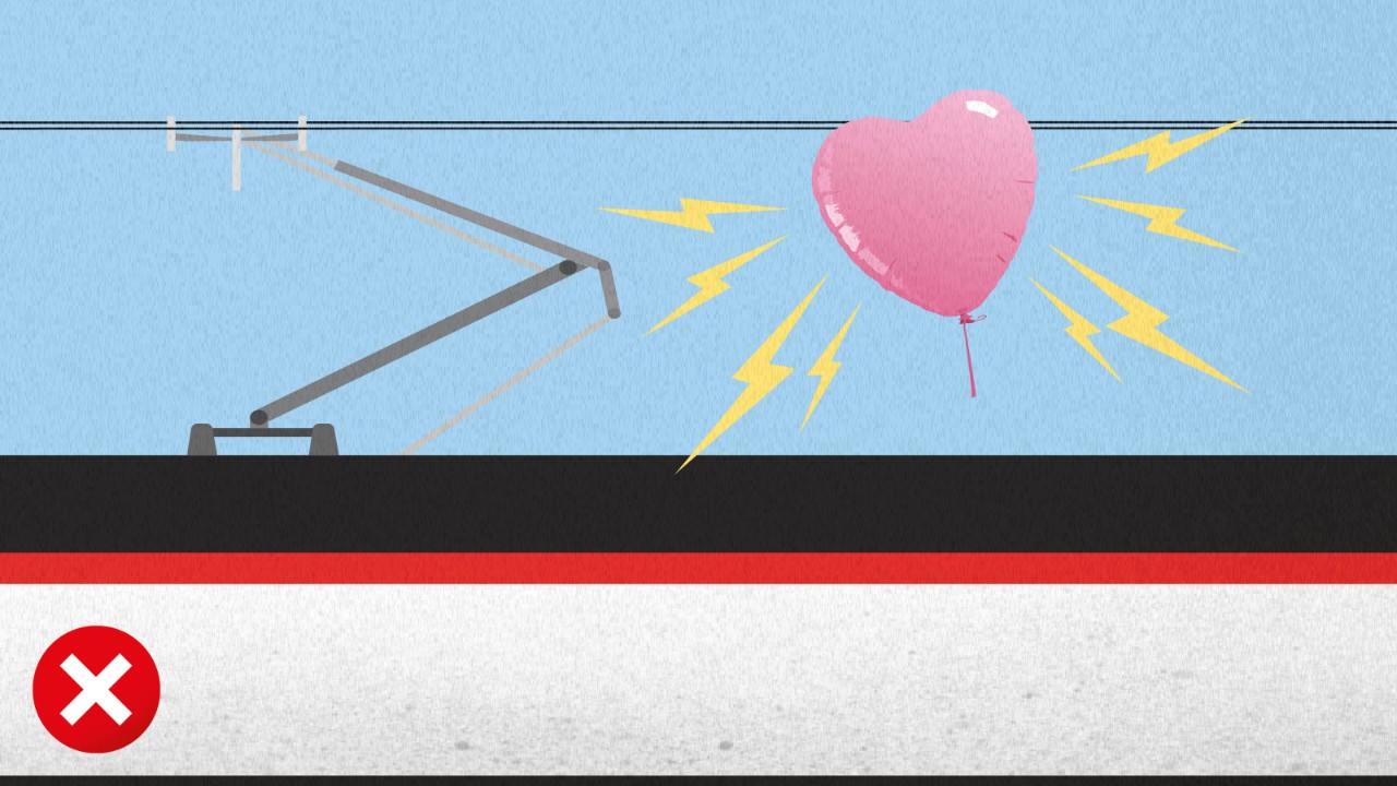 Achten Sie darauf, dass metallbeschichtete Ballons nicht davonfliegen oder beim Ein- und Aussteigen in die Nähe der Fahrleitungen kommen. Befestigen oder verstauen Sie Ballons sicher, bis Sie den Bahnhof verlassen haben. Kommen metallbeschichtete Ballons in die Nähe der Fahrleitung, kann das zu einer Explosion und einem Kurzschluss führen. Das gefährdet die Fahrleitung, den Zug und im schlimmsten Fall Reisende auf dem Perron.
