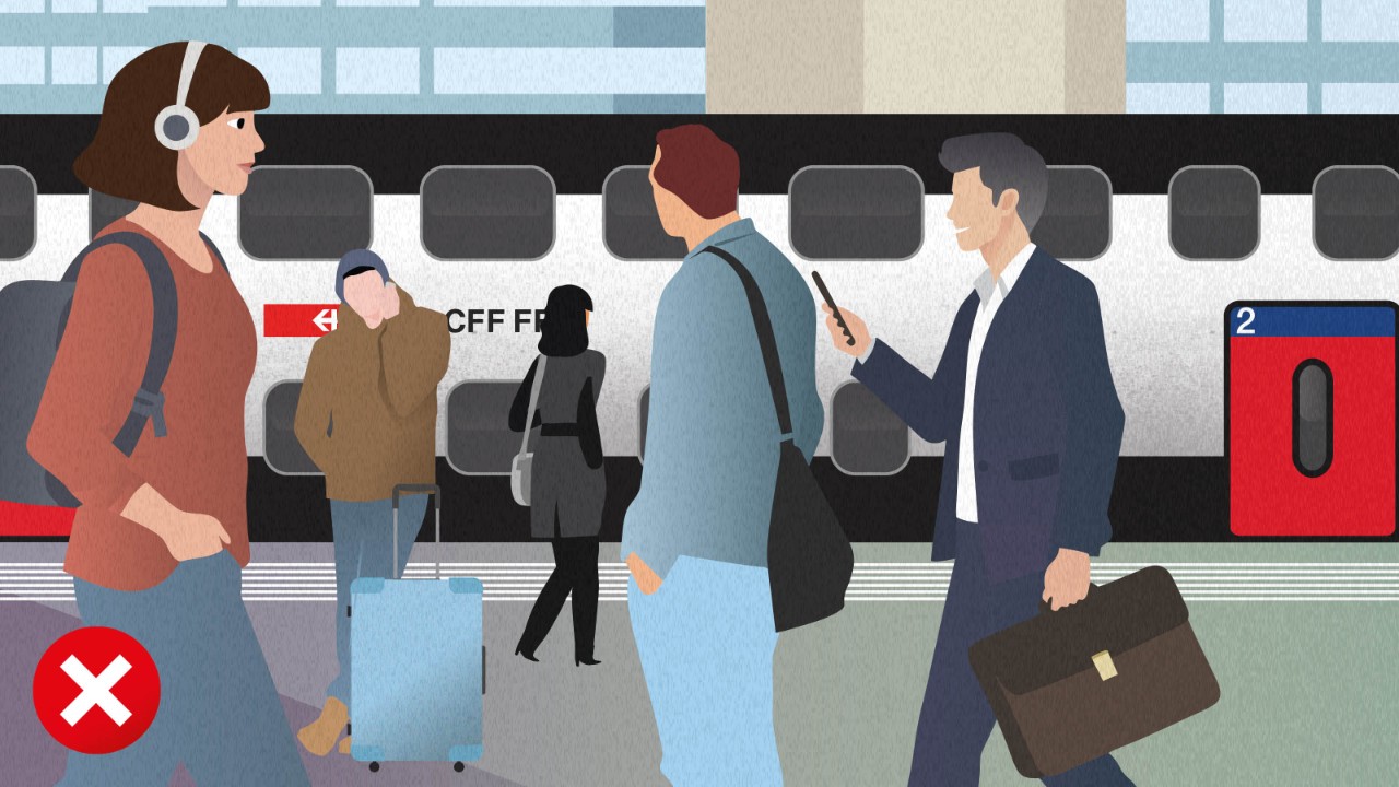 Seien Sie mit offenen Augen und Ohren im Bahnumfeld unterwegs, um zu einer sicheren und angenehmen Reise für Sie selbst und andere beizutragen. Wird beim Gehen der Blick aufs Handy gerichtet, können Unfälle durch Kollisionen mit anderen Personen oder Fahrzeugen entstehen. Wer am Bahnhof Kopfhörer trägt, kann wichtige Ansagen verpassen.