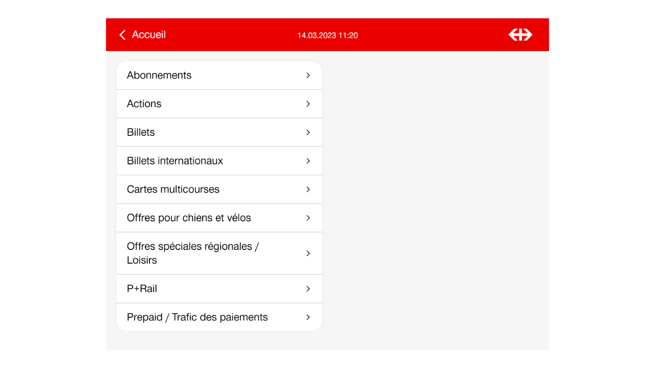 En appuyant sur le bouton «Autres billets et offres» sur la page d’accueil, vous pouvez sélectionner les catégories de produits suivantes: