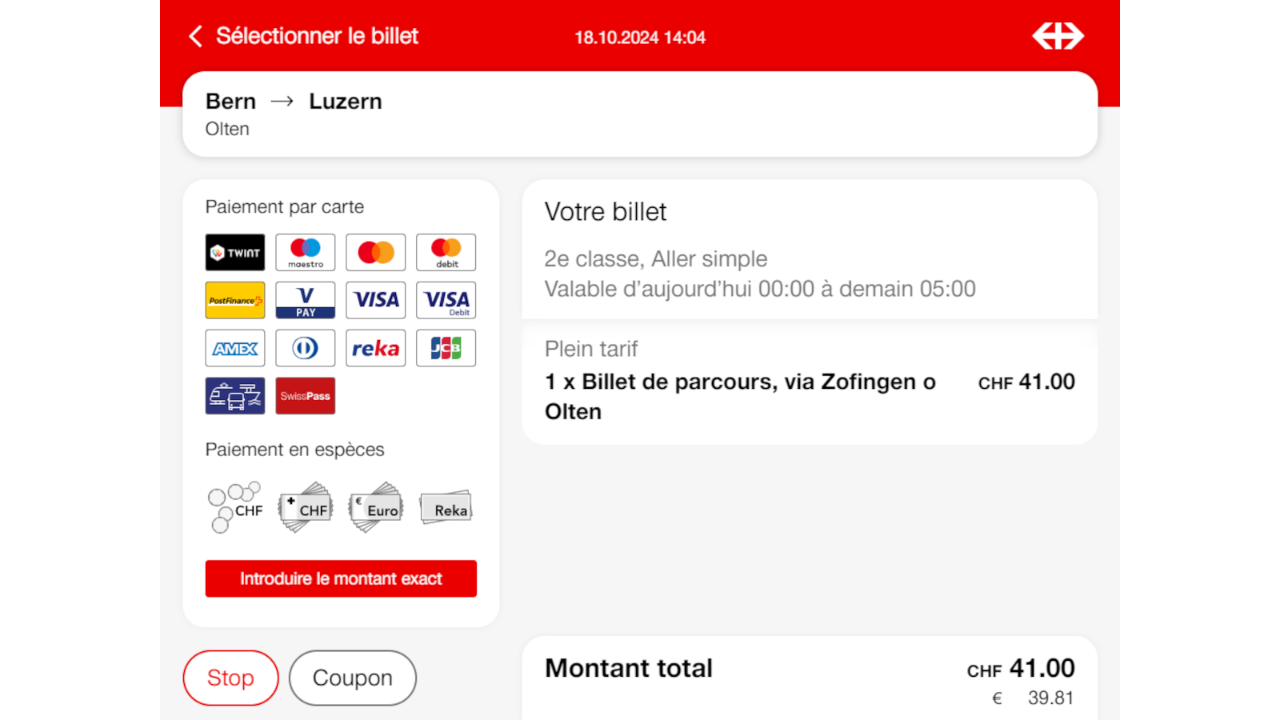 Un résumé montre encore une fois les prestations à payer. Si des moyens de paiement ne sont pas acceptés ou ne sont pas disponibles, ils sont barrés.