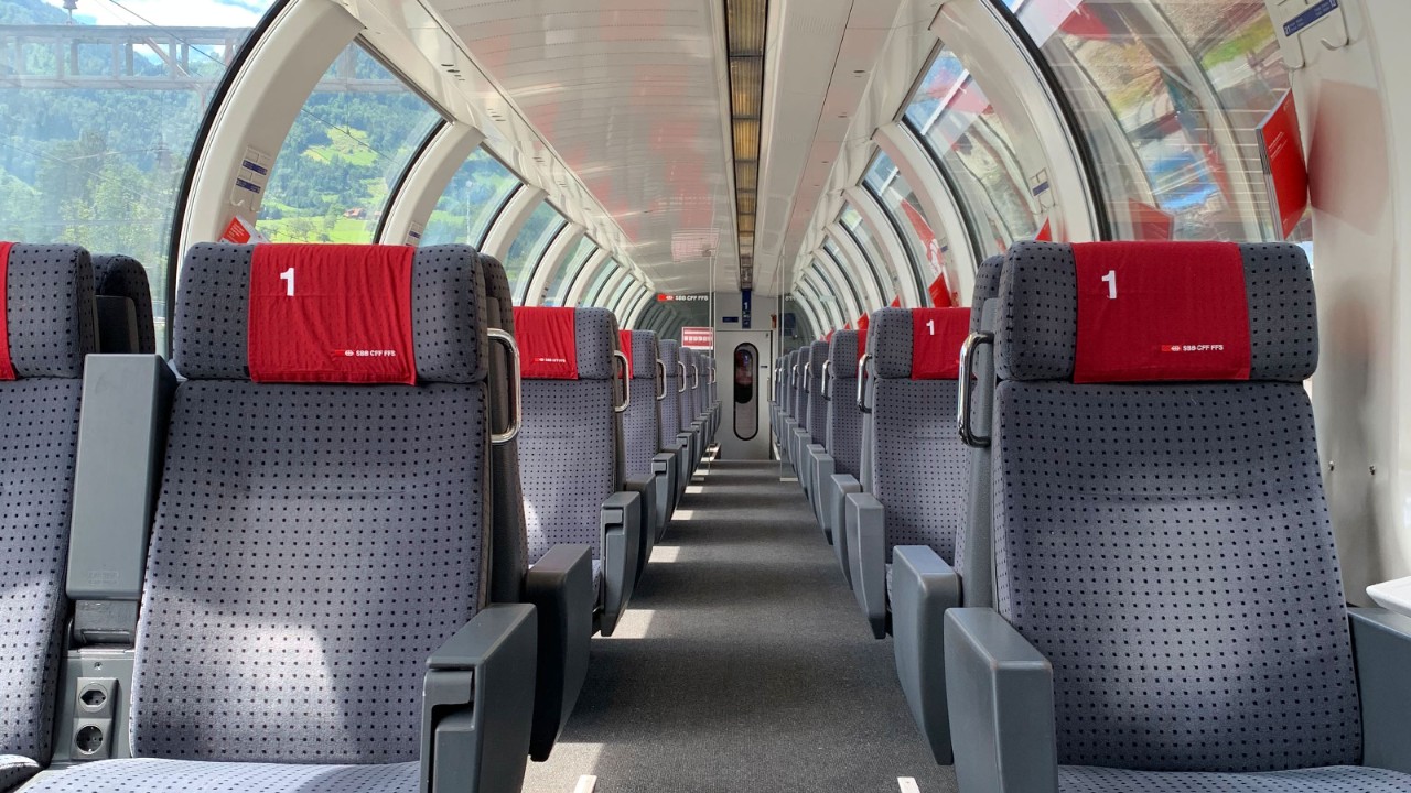 Voiture spacieuse à couloir central équipée de fenêtres panoramiques.